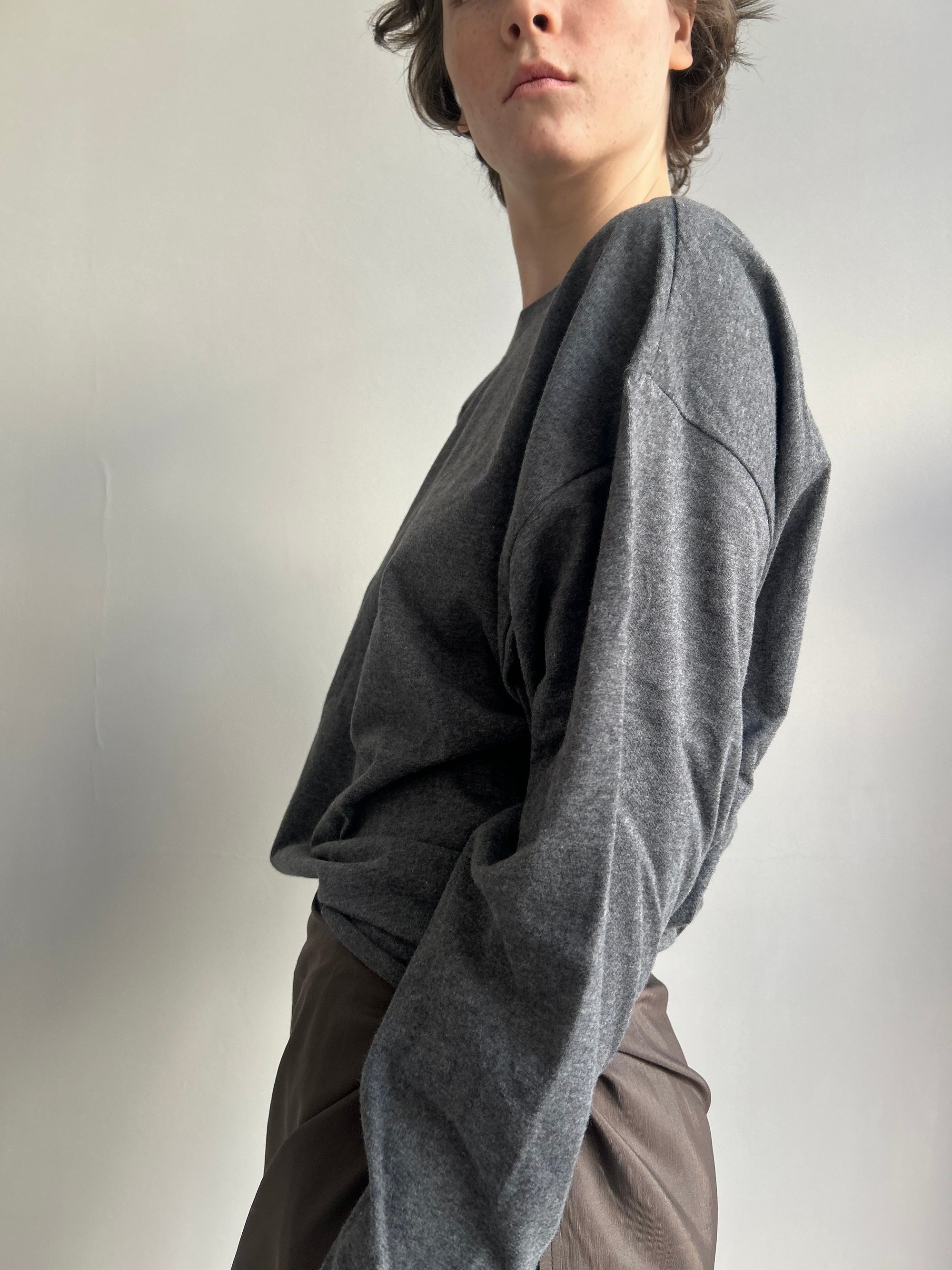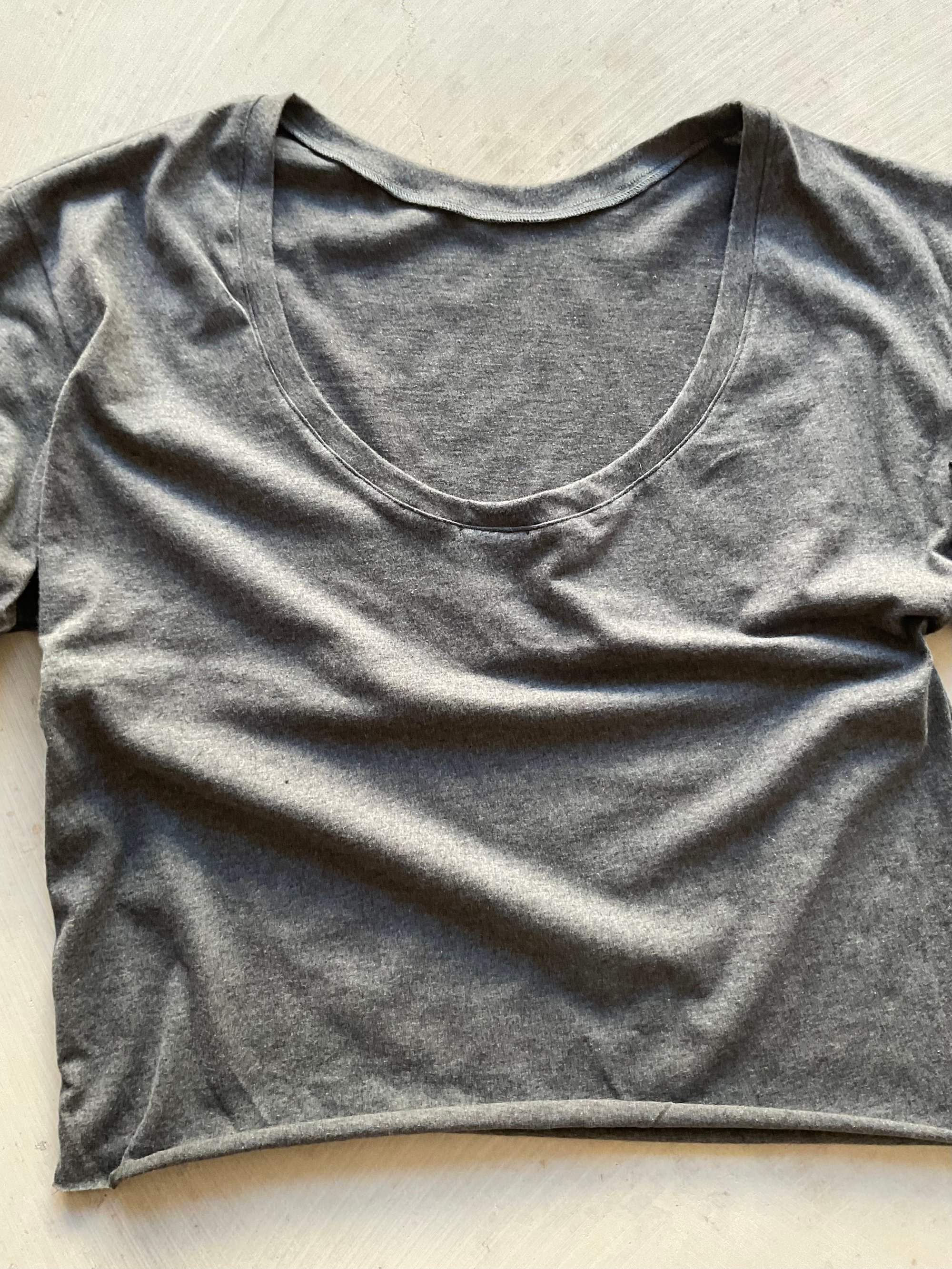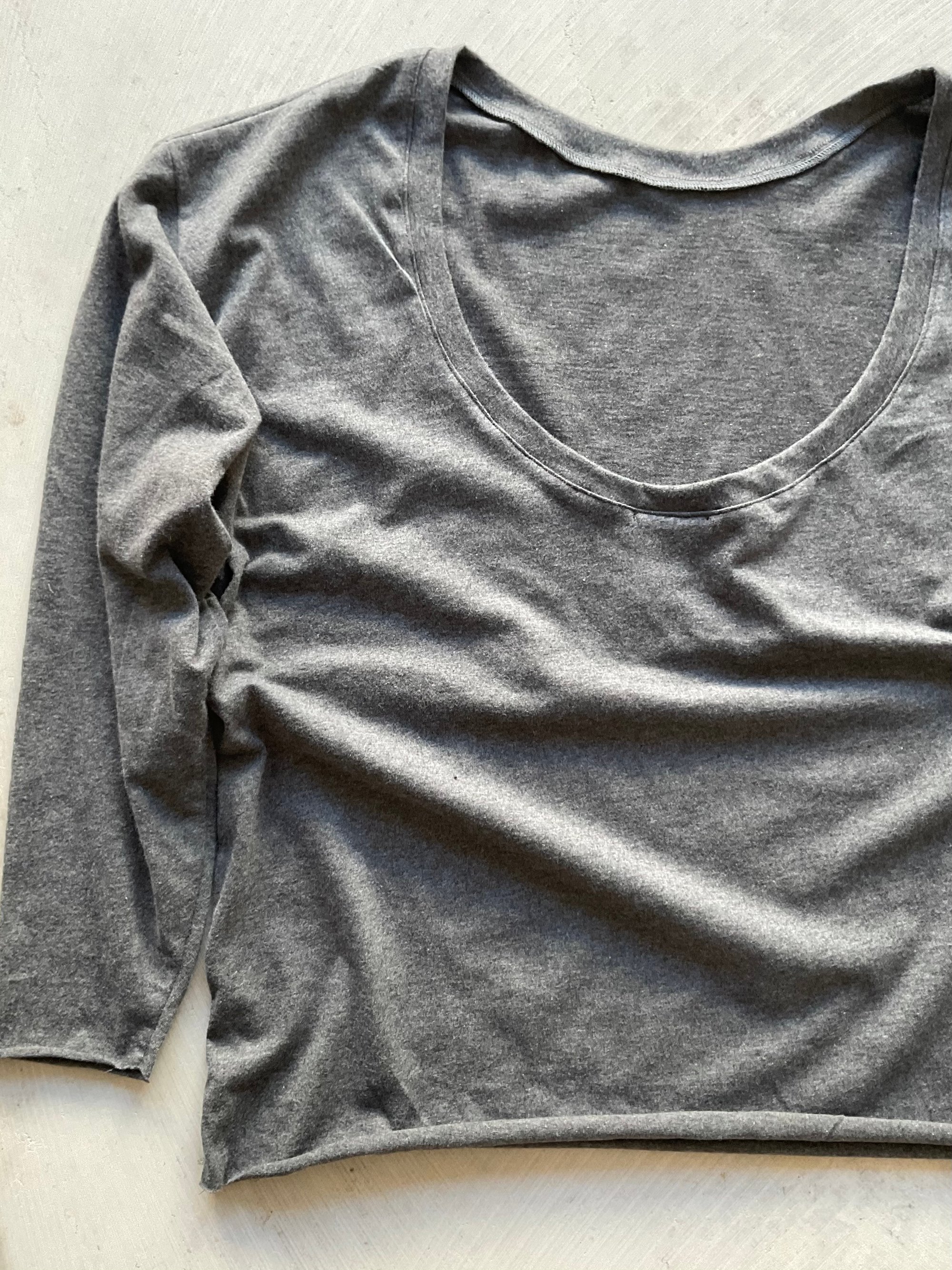 Mit loose Fit, langen Ärmeln und raw Edges. Atmungsaktiv, minimal und solo oder unter Strick tragbar.