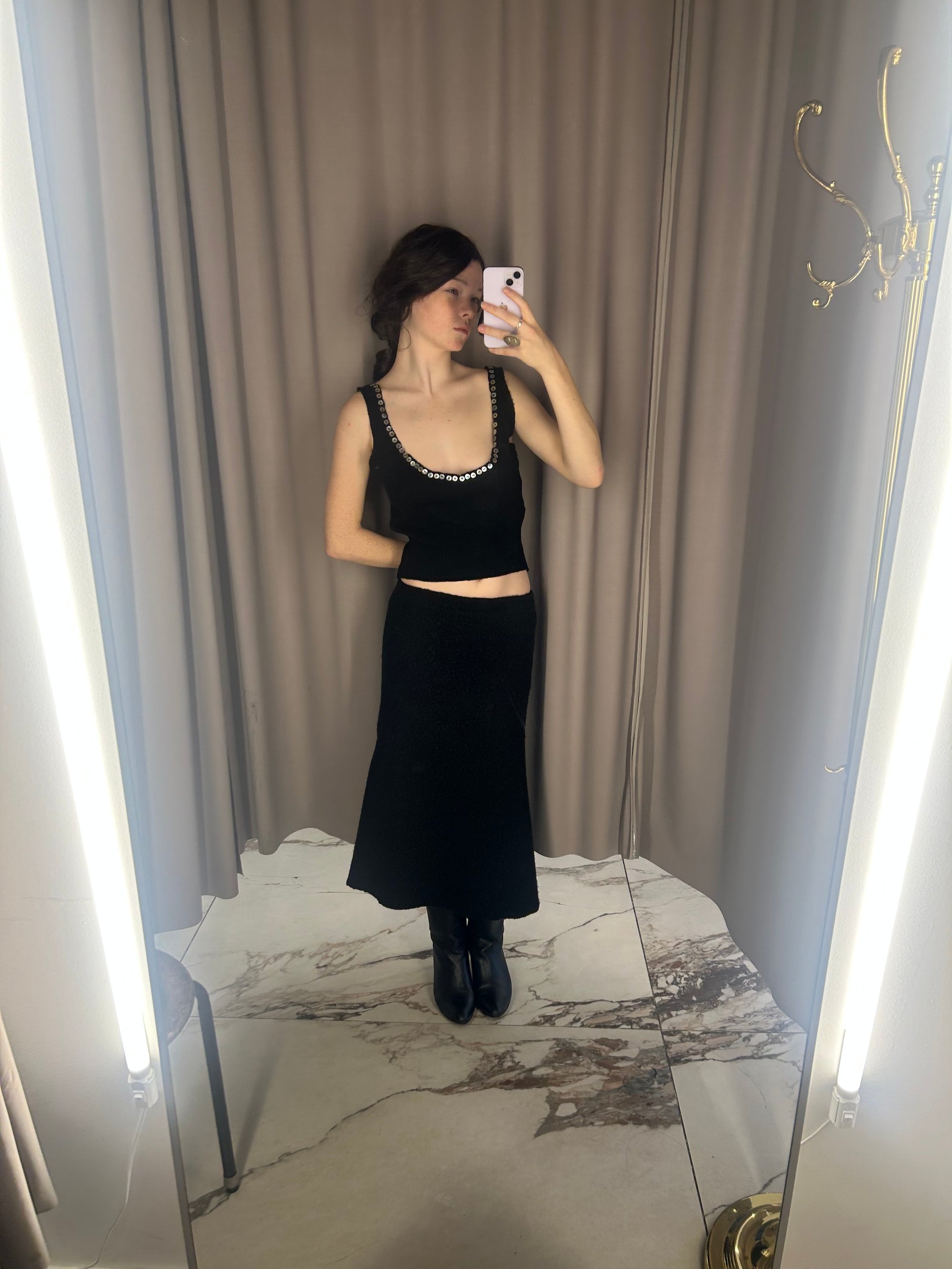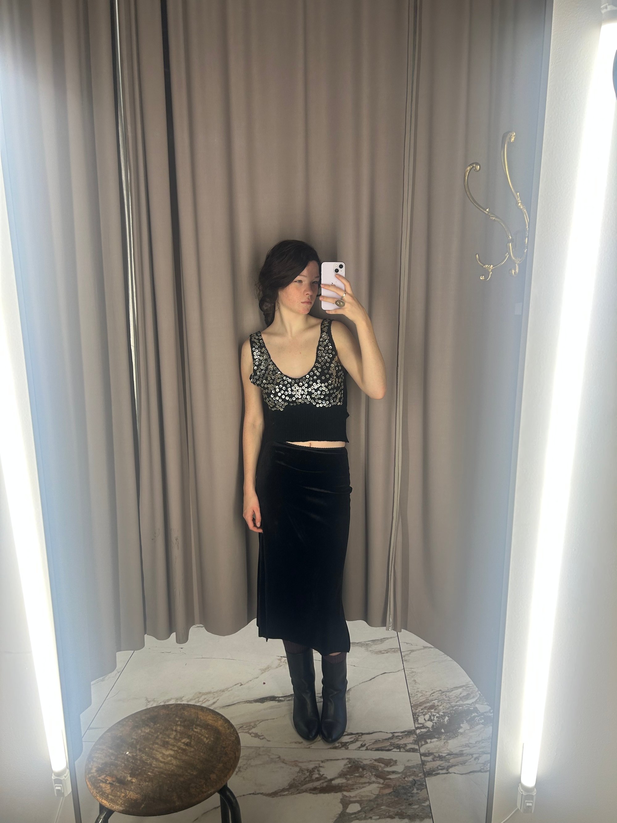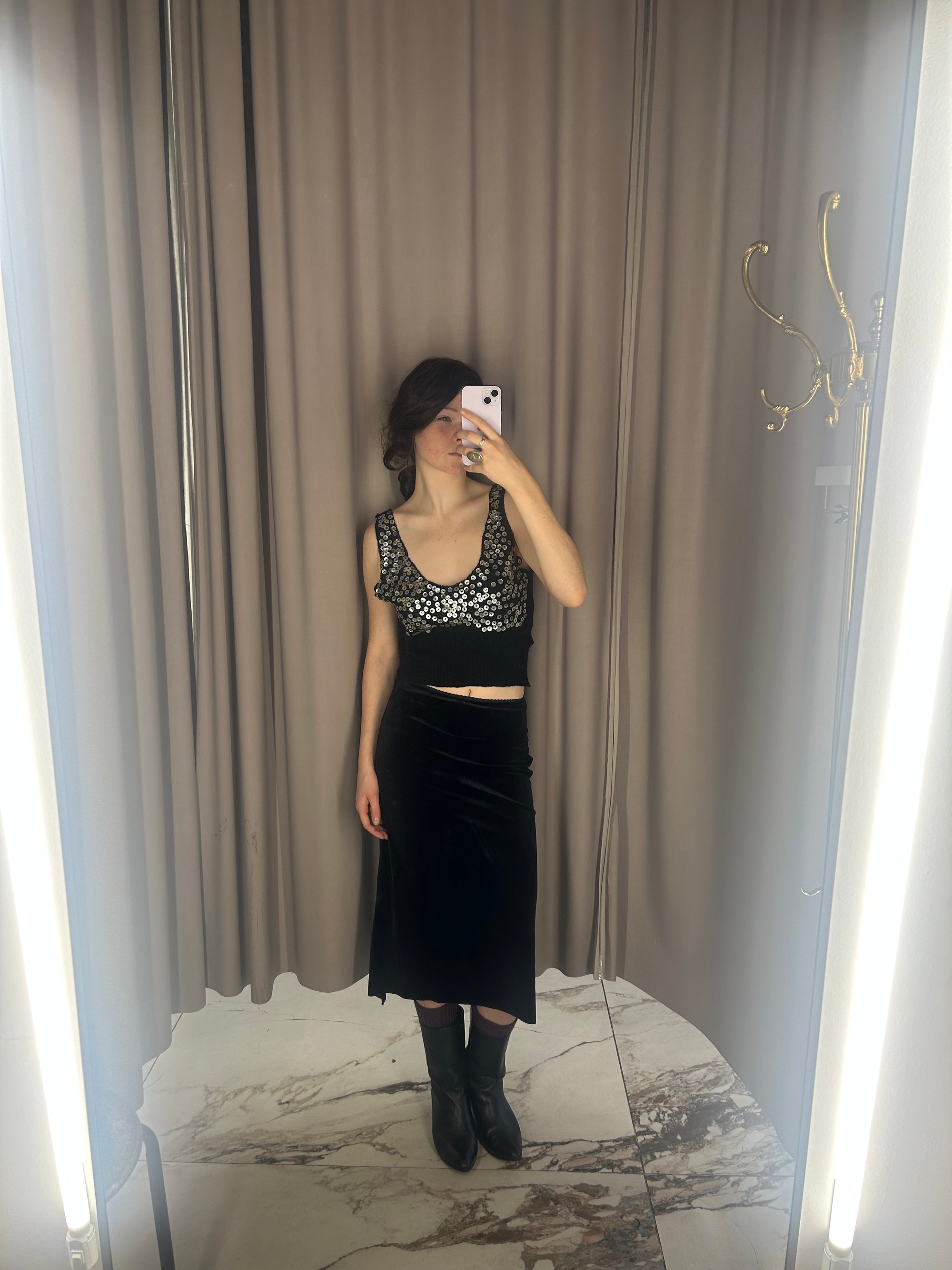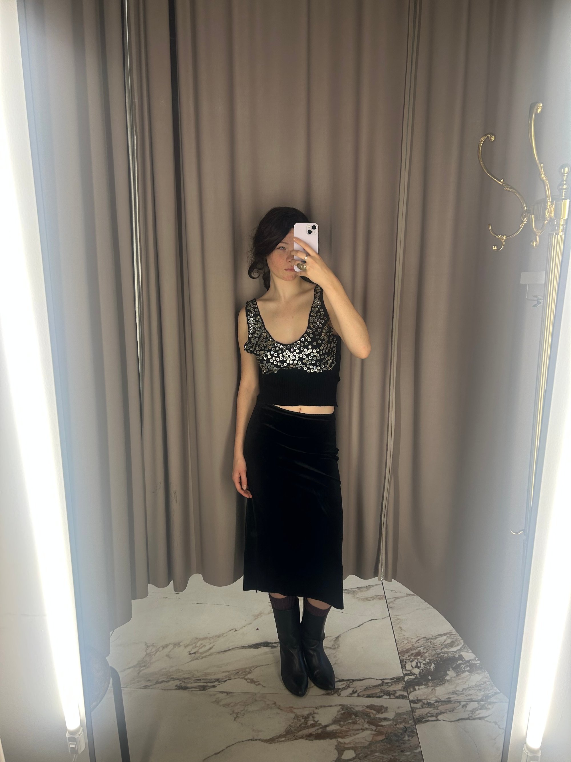 A soft, sculpted skirt cut from stretchy velvet with a subtle, pebbled texture. The fabric has an easy drape that moves quietly with you, giving the silhouette a relaxed yet refined feel.