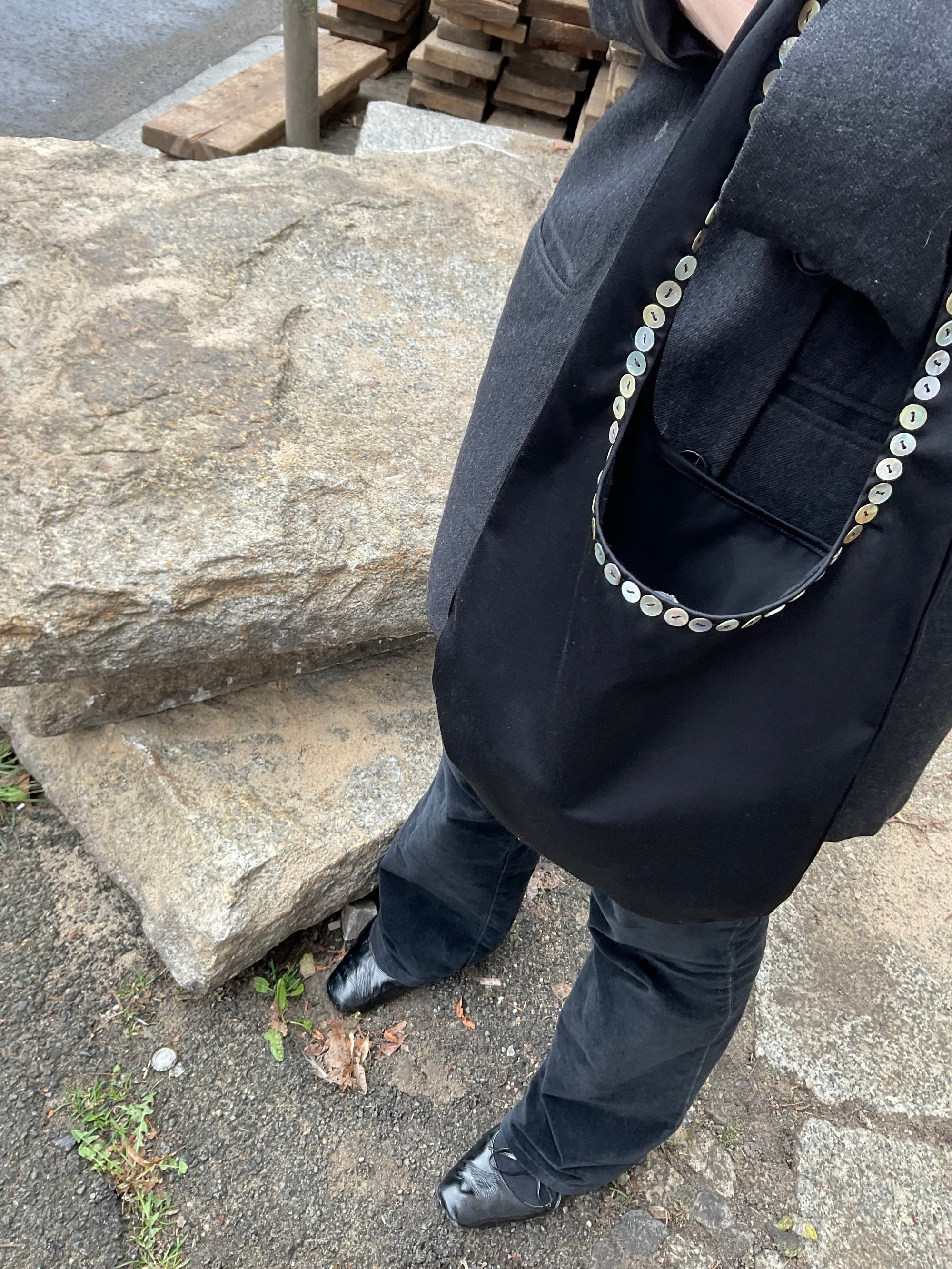 One side finished with a row of natural pearl buttons.