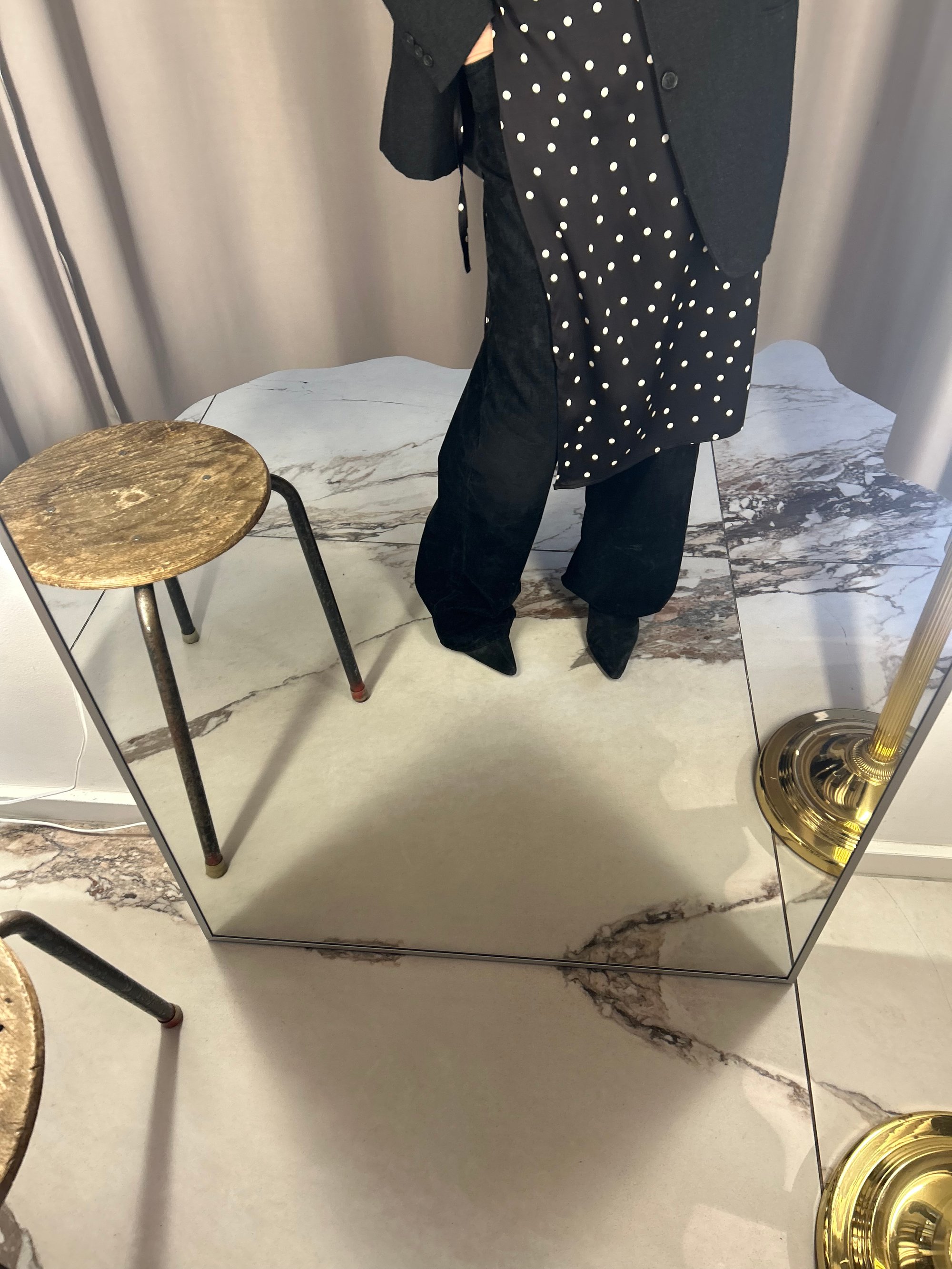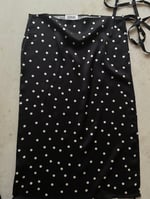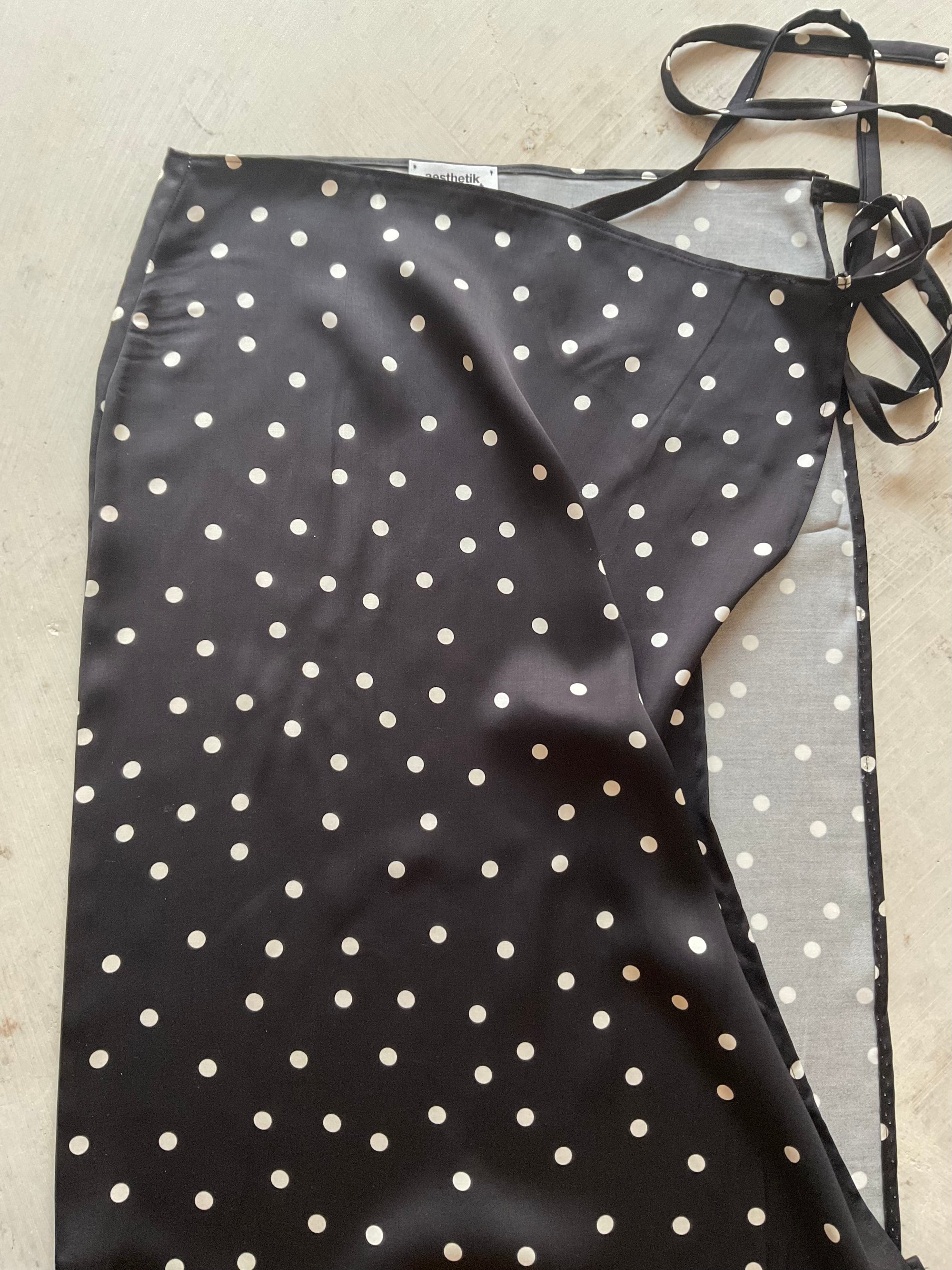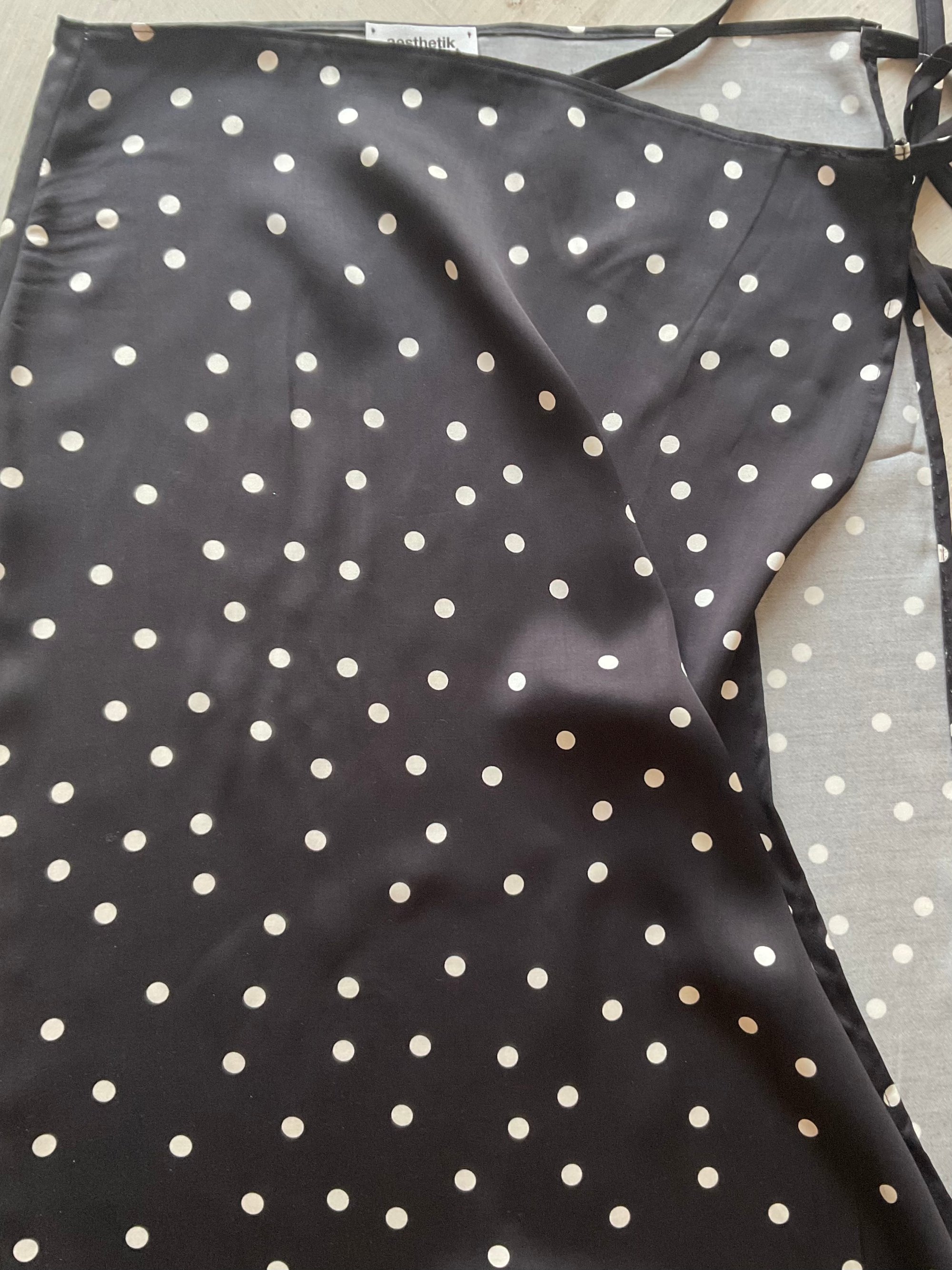 Ein Wickel-Apron aus italienischem Viskose-Satin mit grafischem Punktmuster in Schwarz-Weiß.
