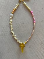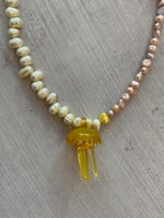 A unique necklace combining soft pink and cream freshwater pearls with a handmade glass Medusa pendant.
