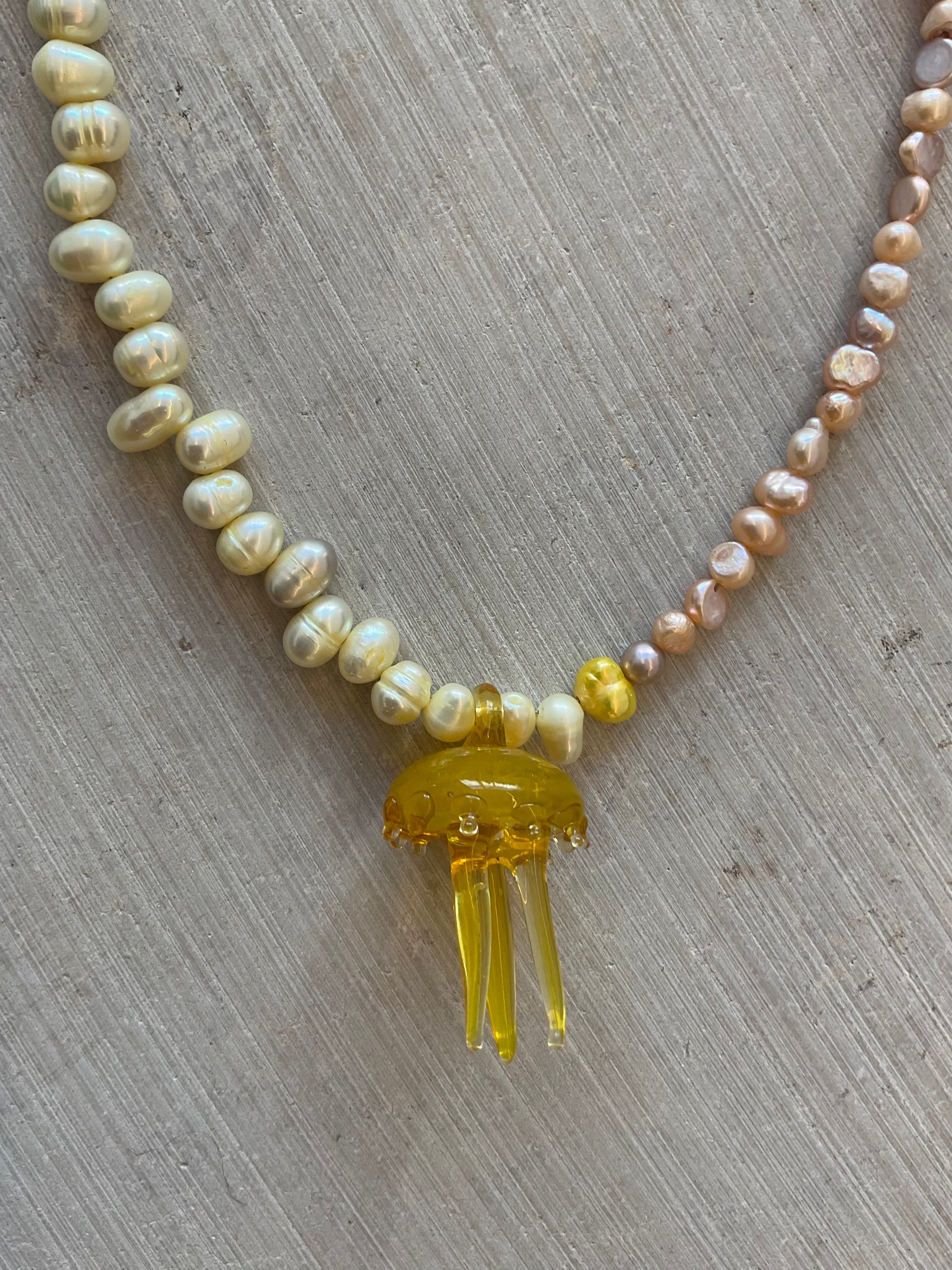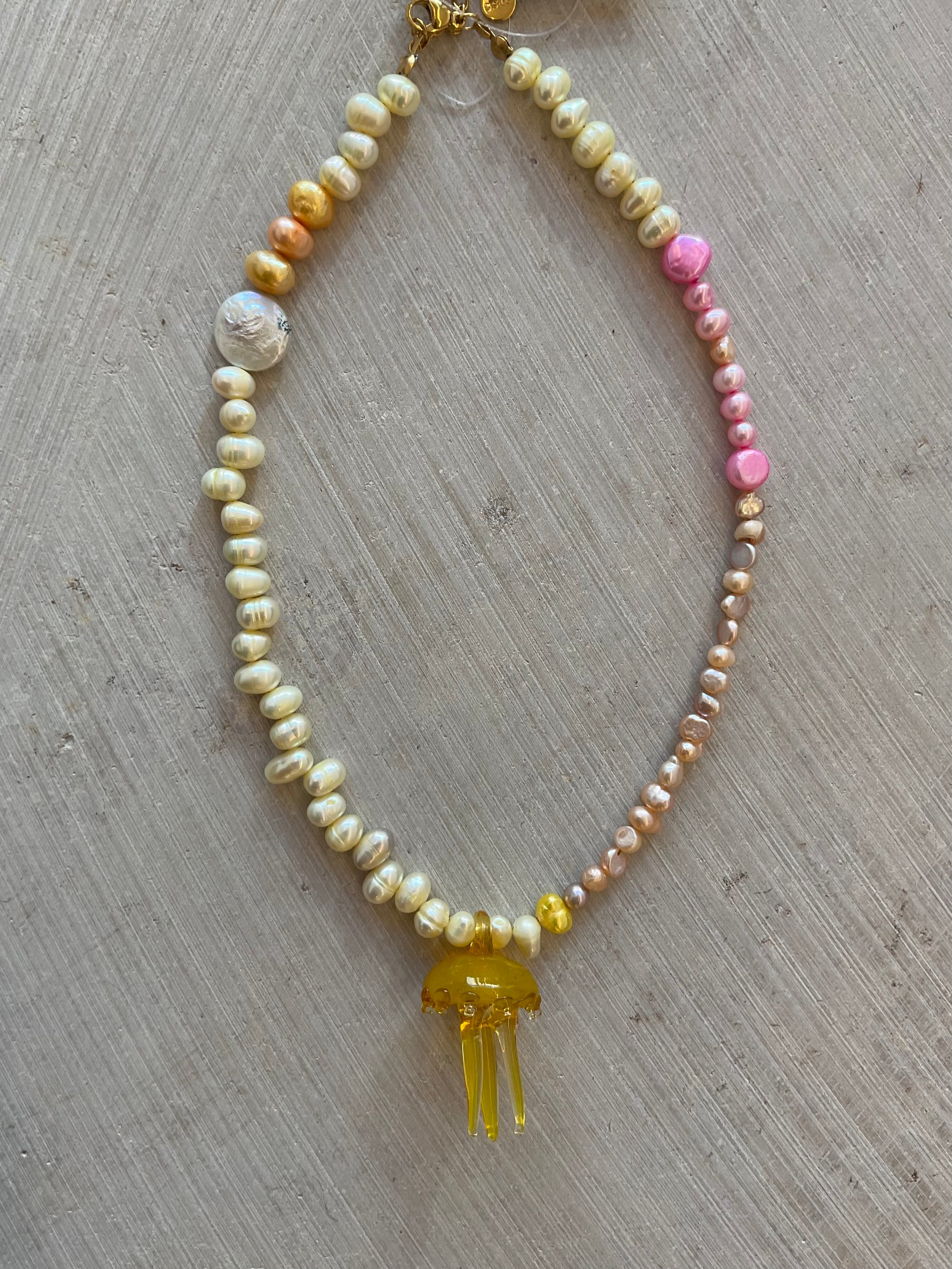 Each detail stands out — from the natural shapes of the pearls to the sculptural glass jellyfish that catches the light beautifully.
