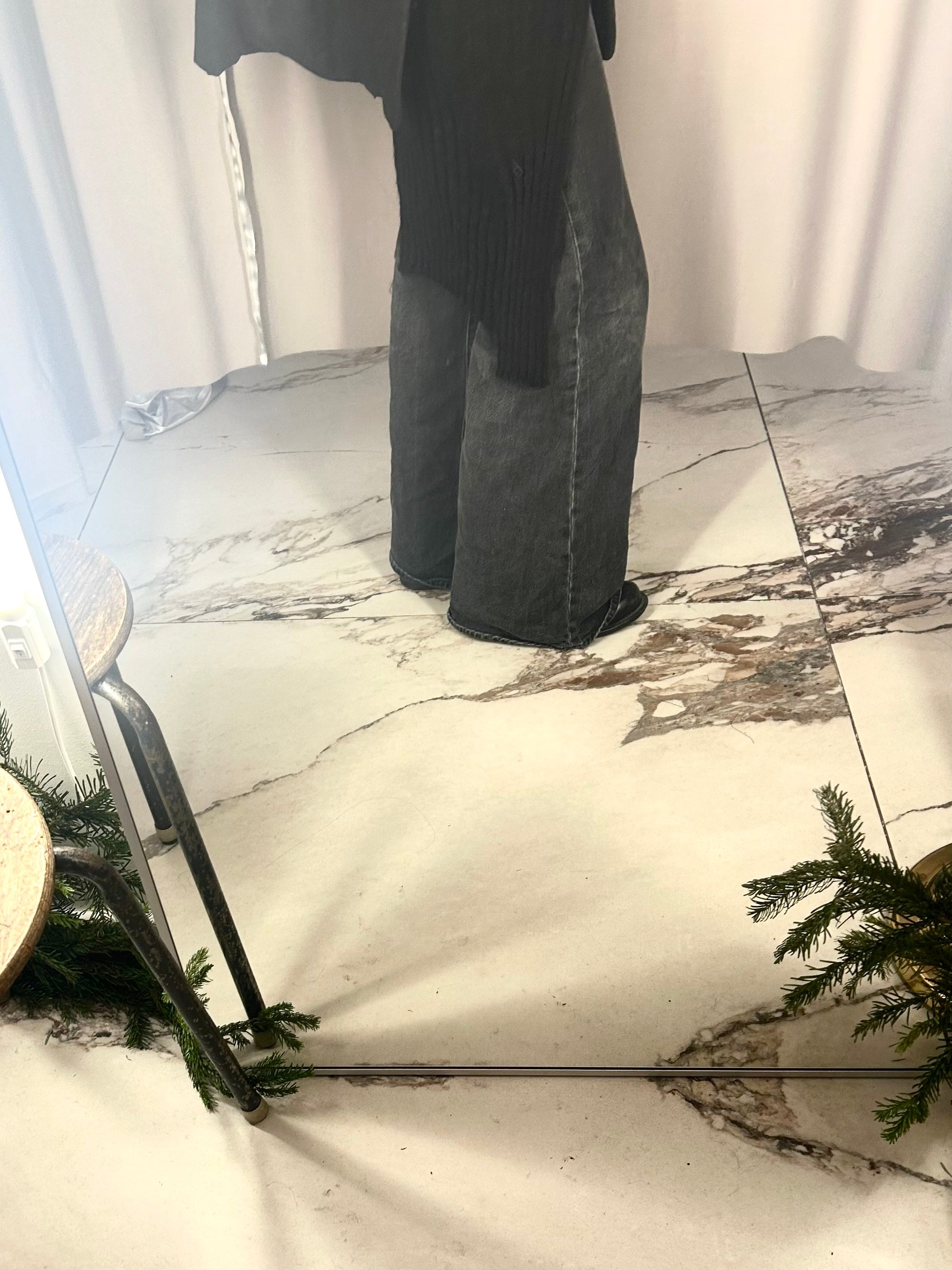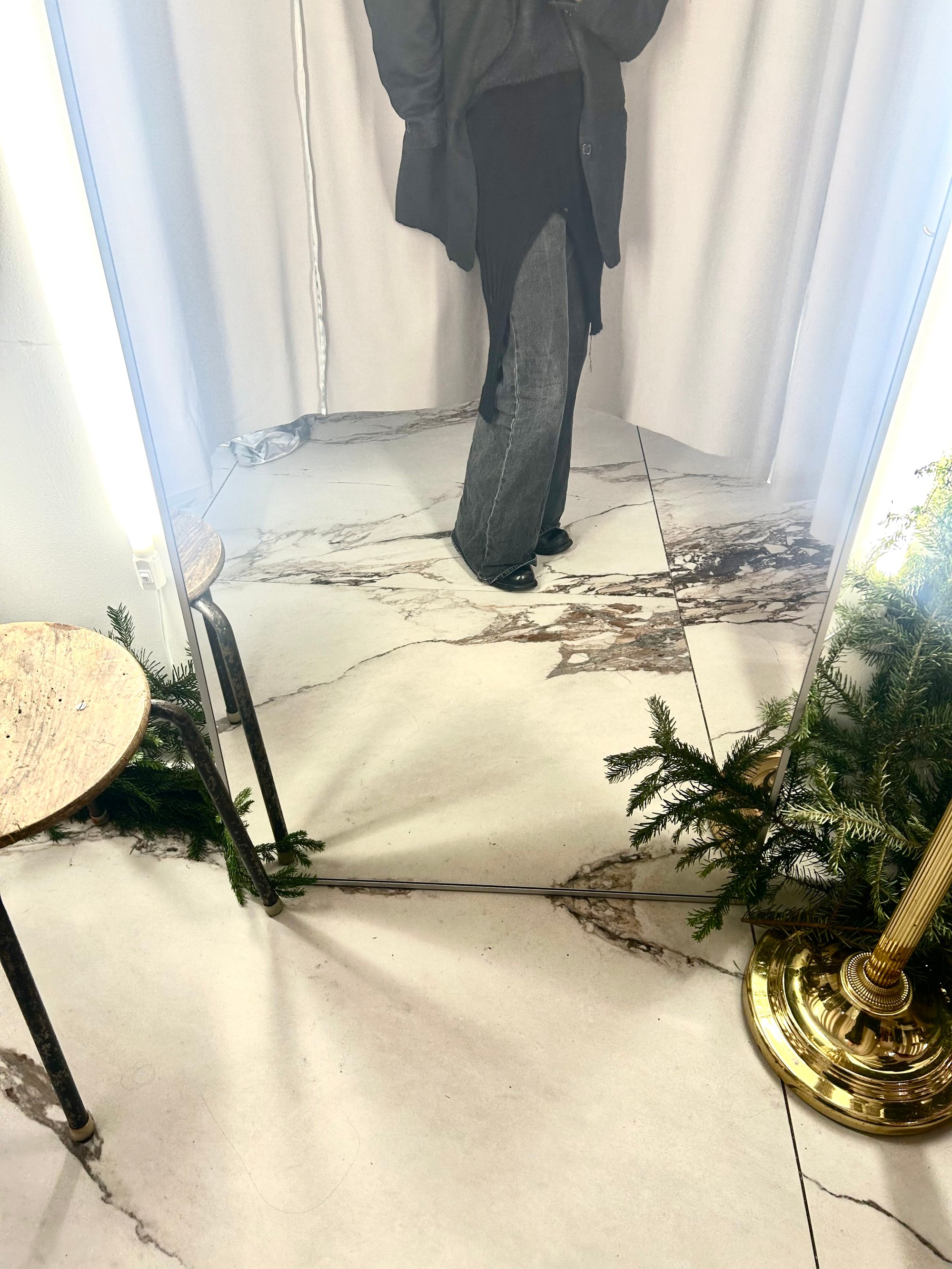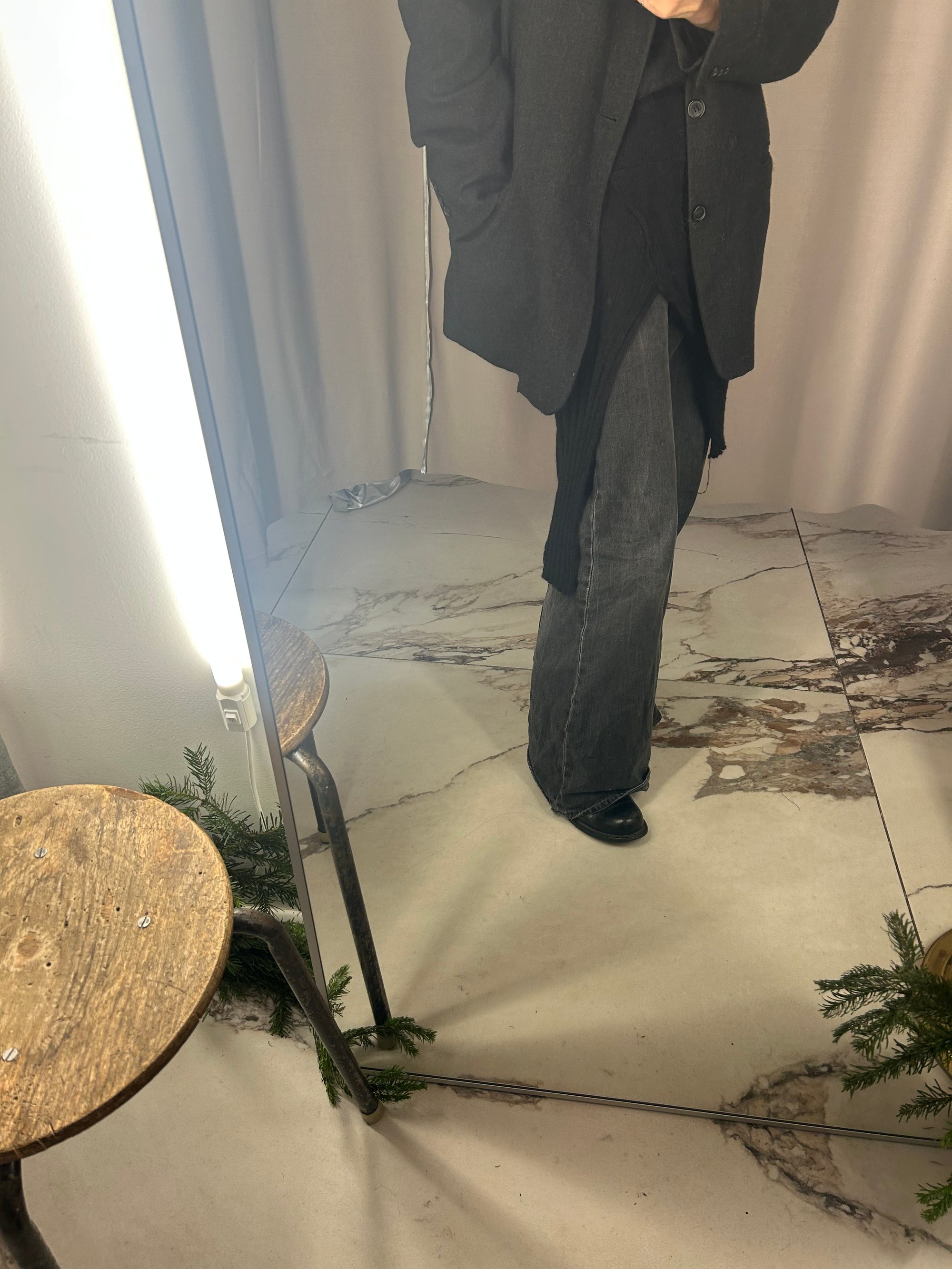 The sculptural silhouette is created through a panel construction that wraps and drapes naturally on the body. Designed for layering — worn over trousers it forms a bold architectural line, worn alone it becomes an expressive statement piece.