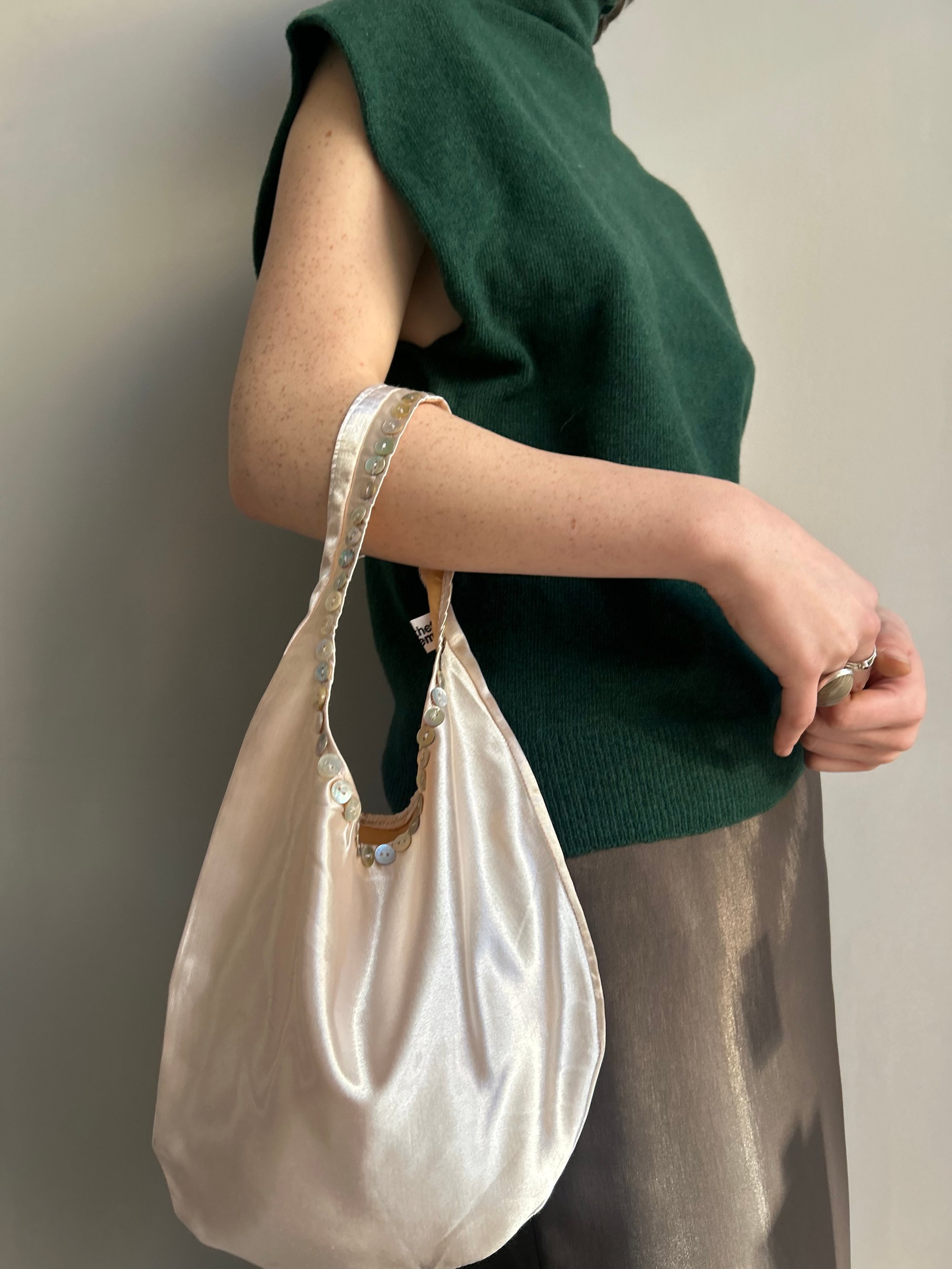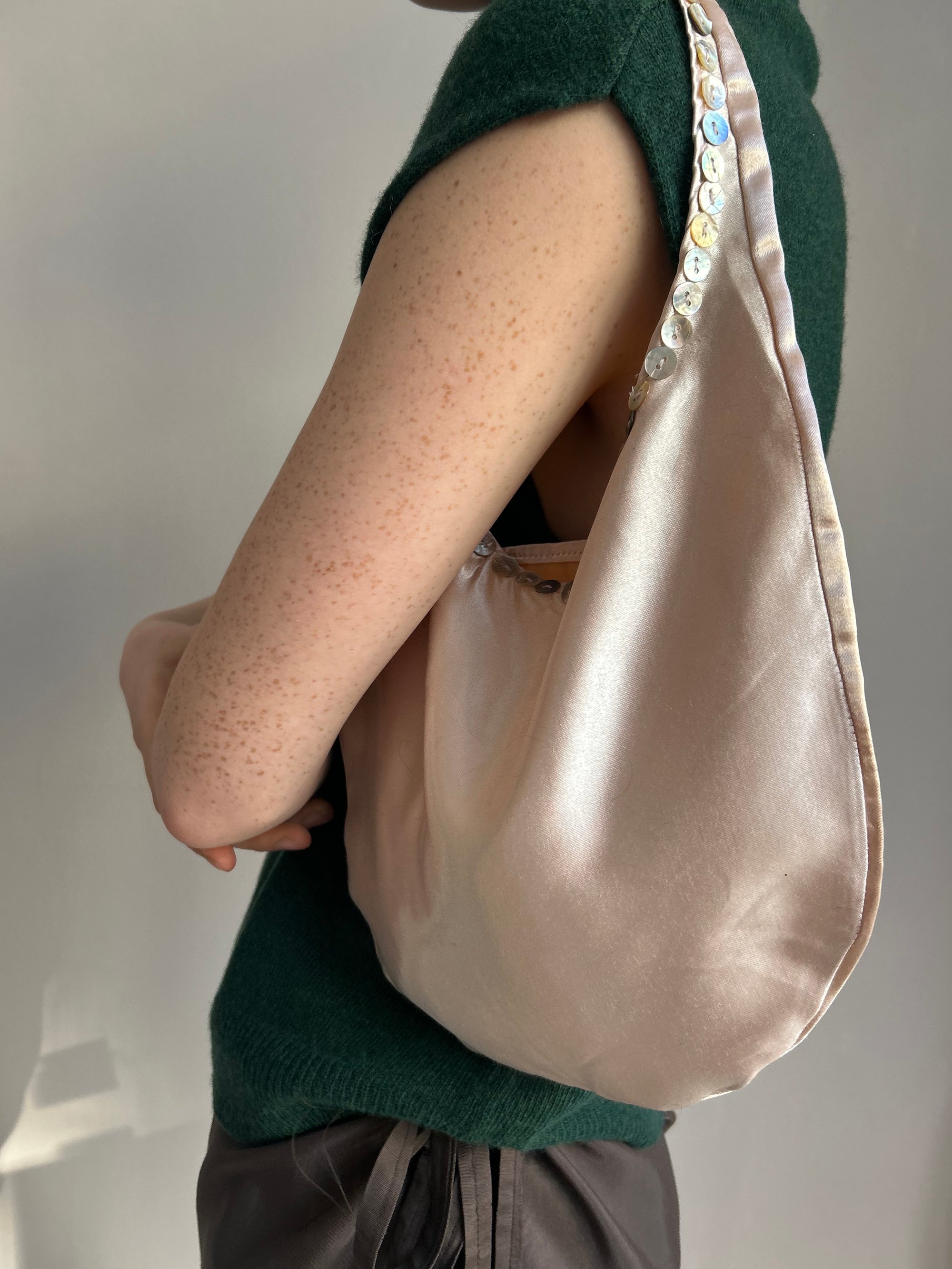 Soft hobo bag made from a viscose–polyester satin blend, with a subtle powdery ballet-pink sheen.