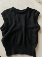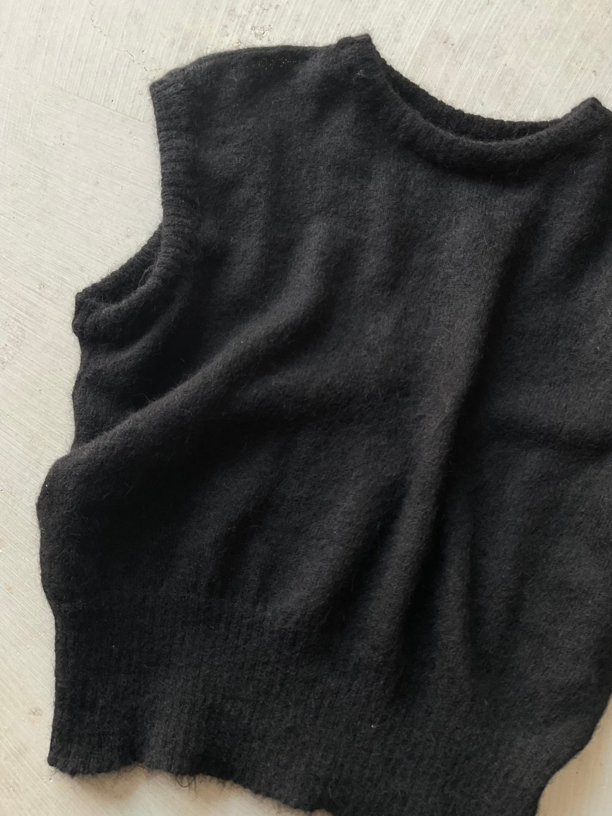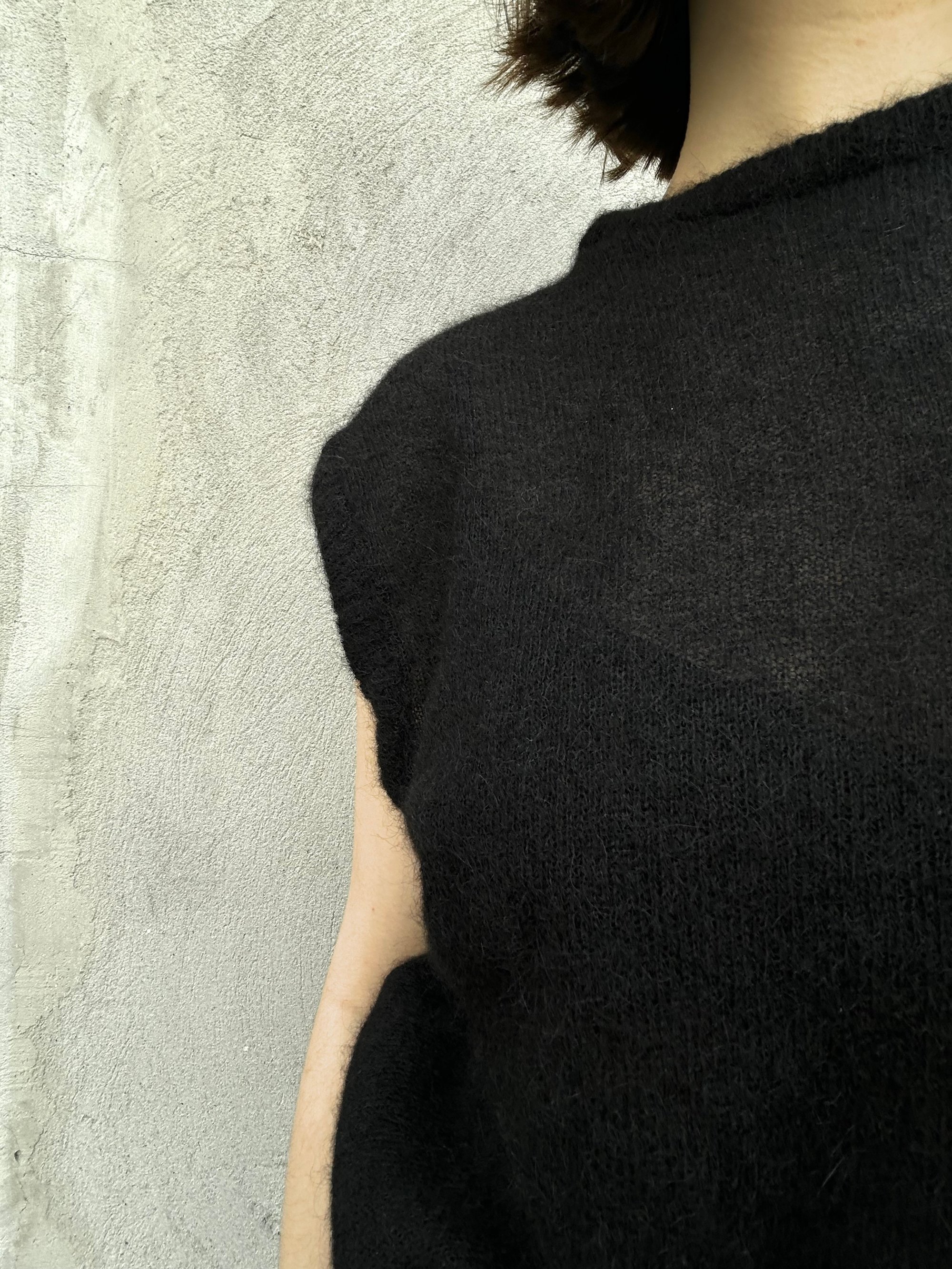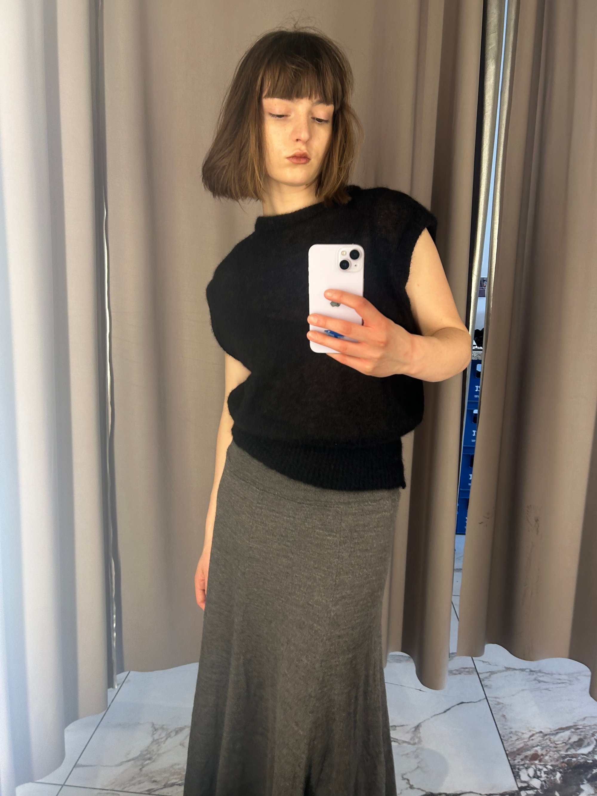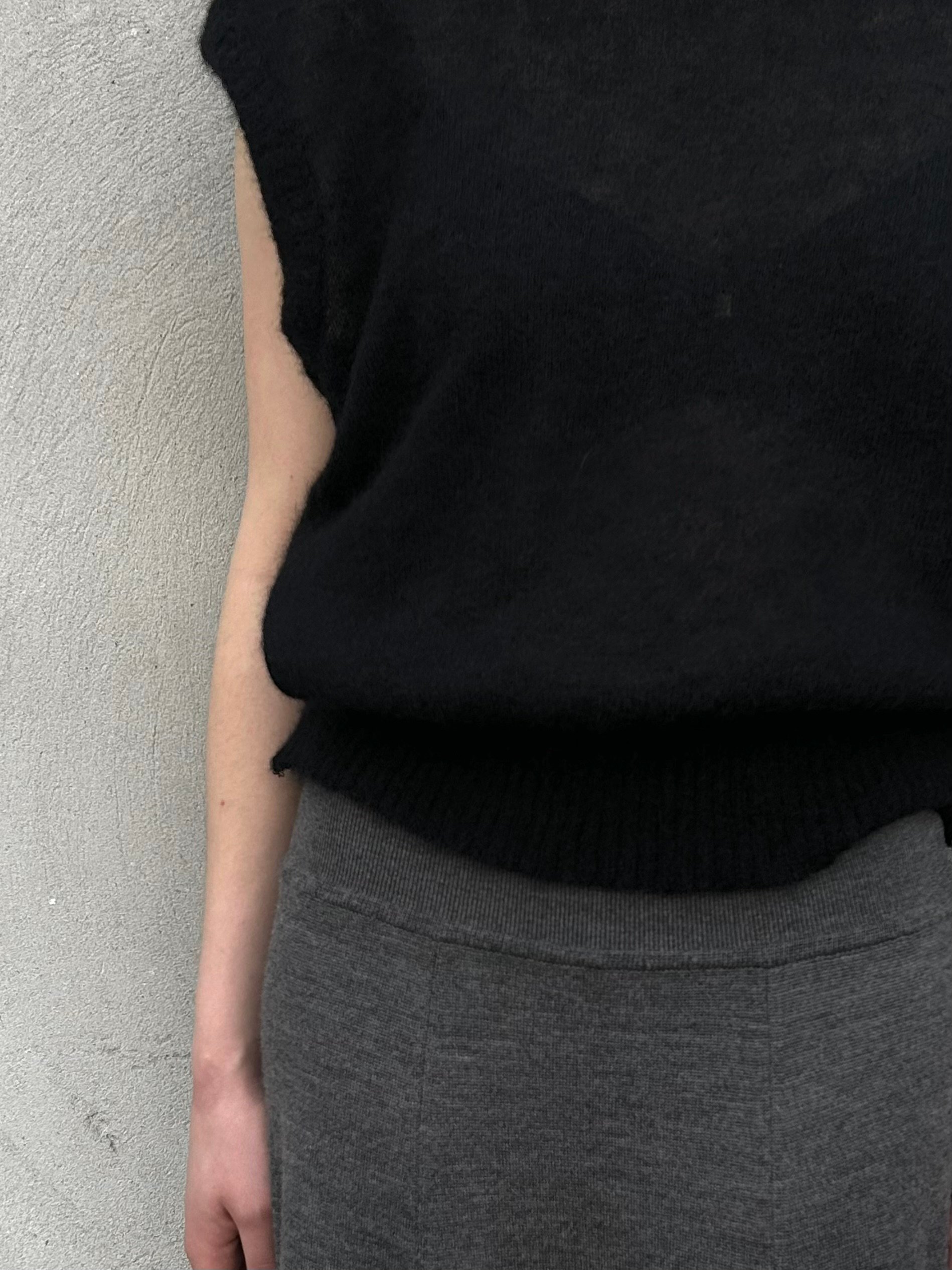 Inspired by classic men’s knit vests, the silhouette features wide shoulders and a clean neckline, creating a relaxed yet structured shape.