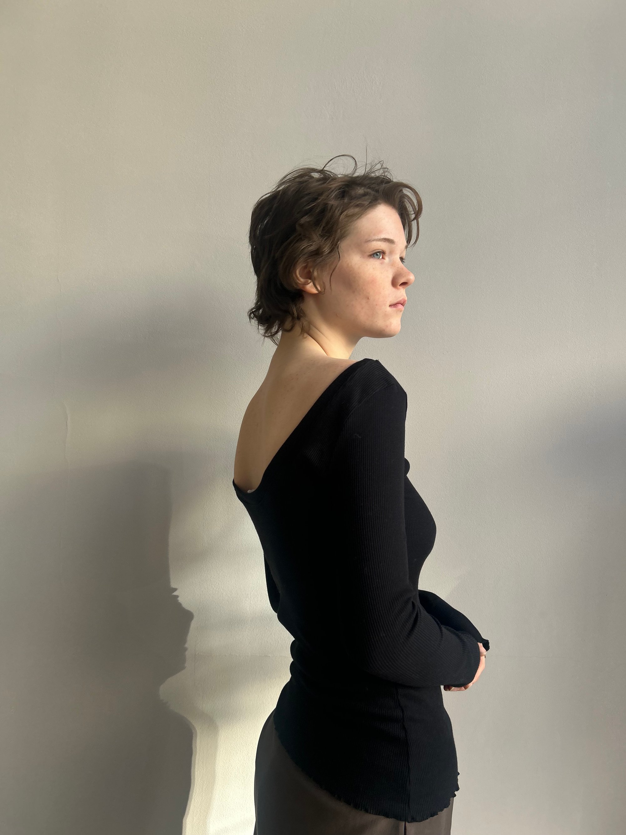 Das Pia Top ist ein neuer enganliegender Longsleeve aus Rippjersey mit dem gleichen offenen Rücken wie bei unserem Bestseller-Sweatshirt.
