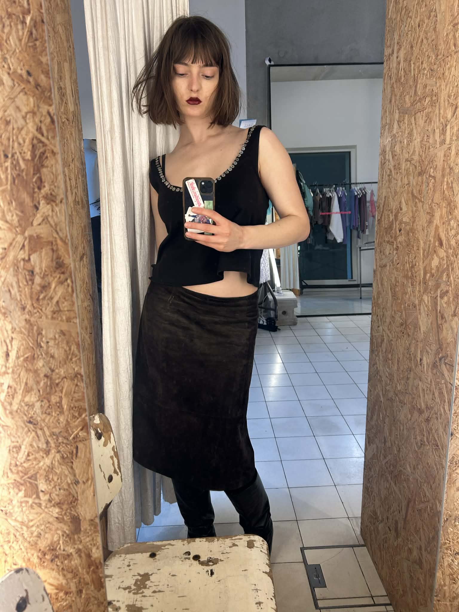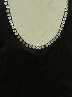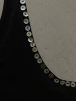 The rounded front neckline is framed with small mother-of-pearl buttons, adding a quiet glow against the black cotton. The back is slightly deeper, revealing the shoulder blades and emphasizing the elegance of movement.