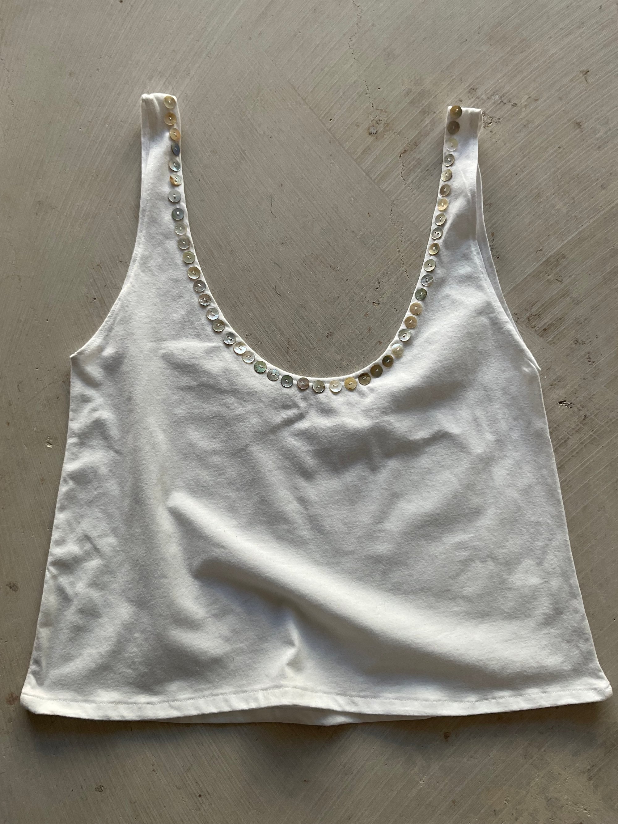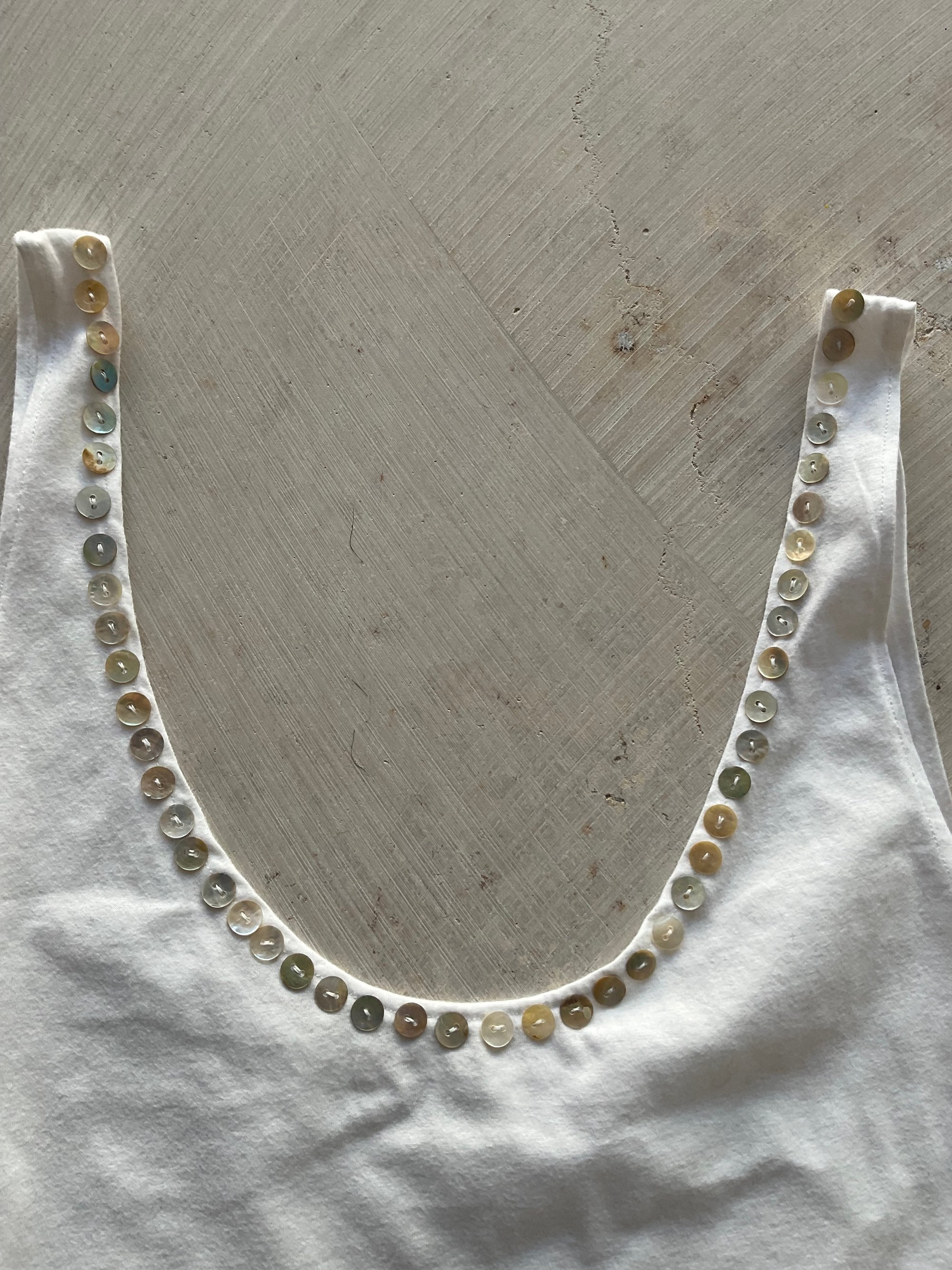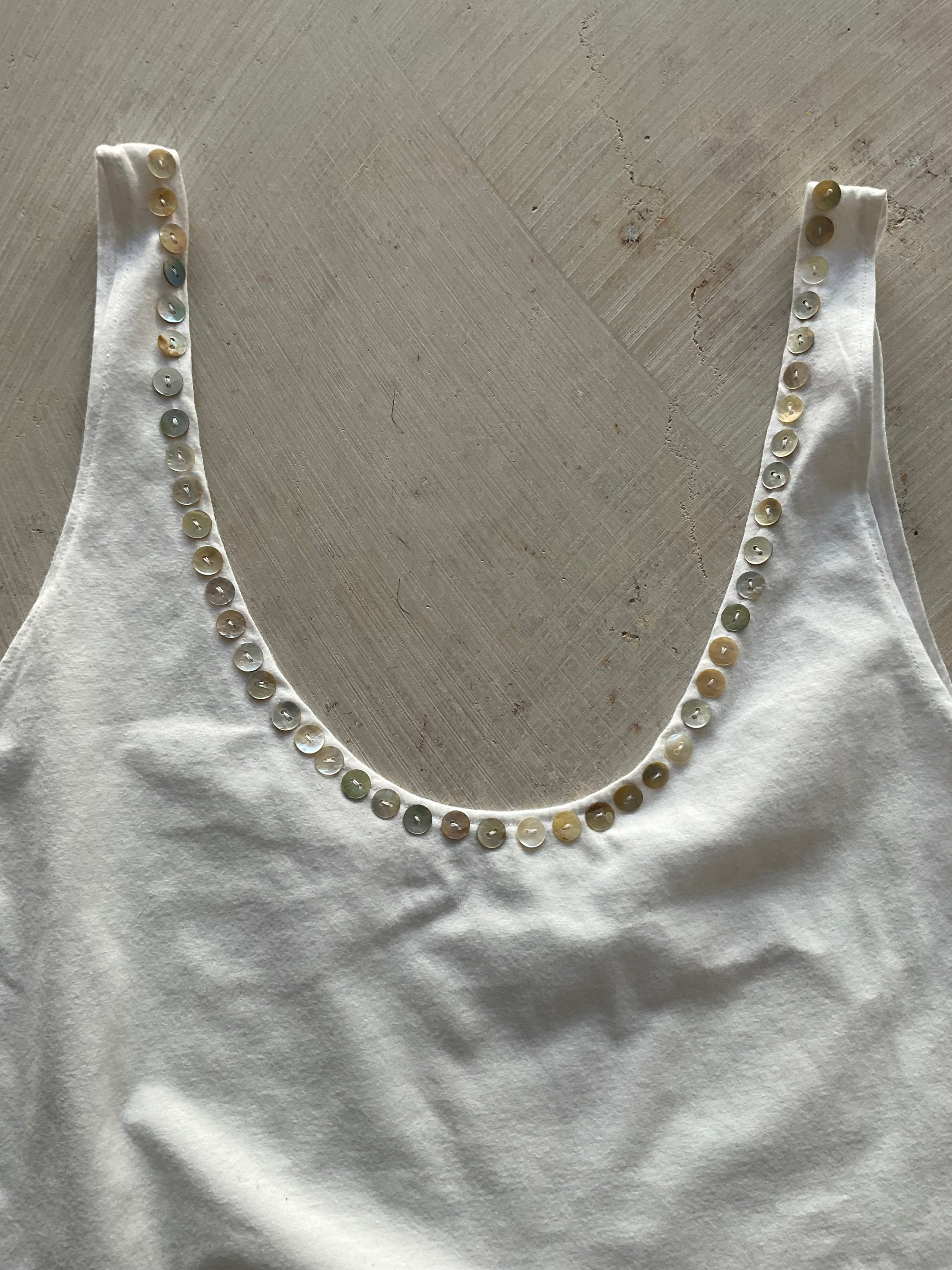• Mother-of-pearl buttons at the front neckline