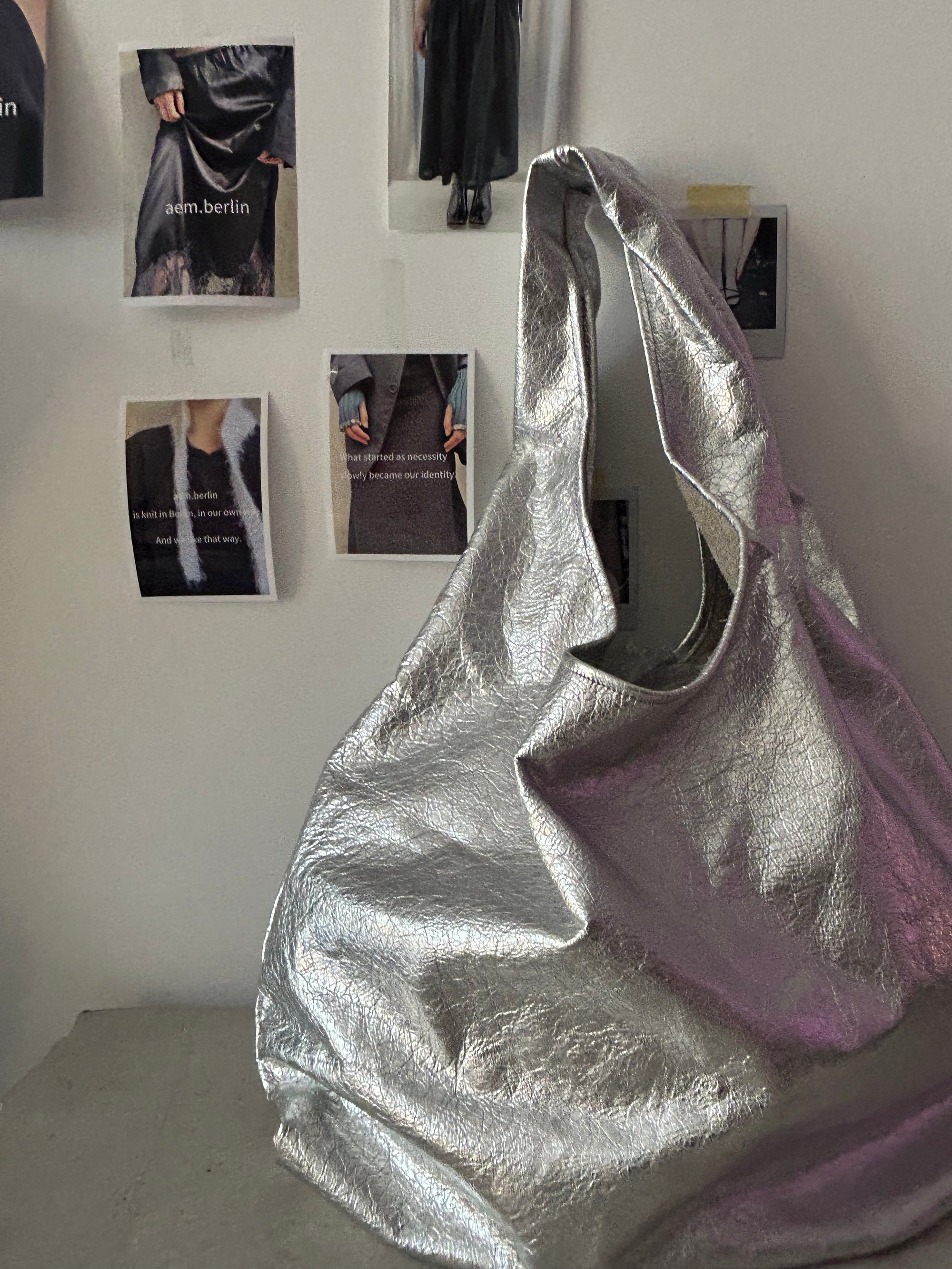 The Silver Leather Hobo is crafted from Italian metallic leather, shaped into a soft, sculptural silhouette that sits naturally under the arm.