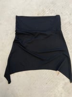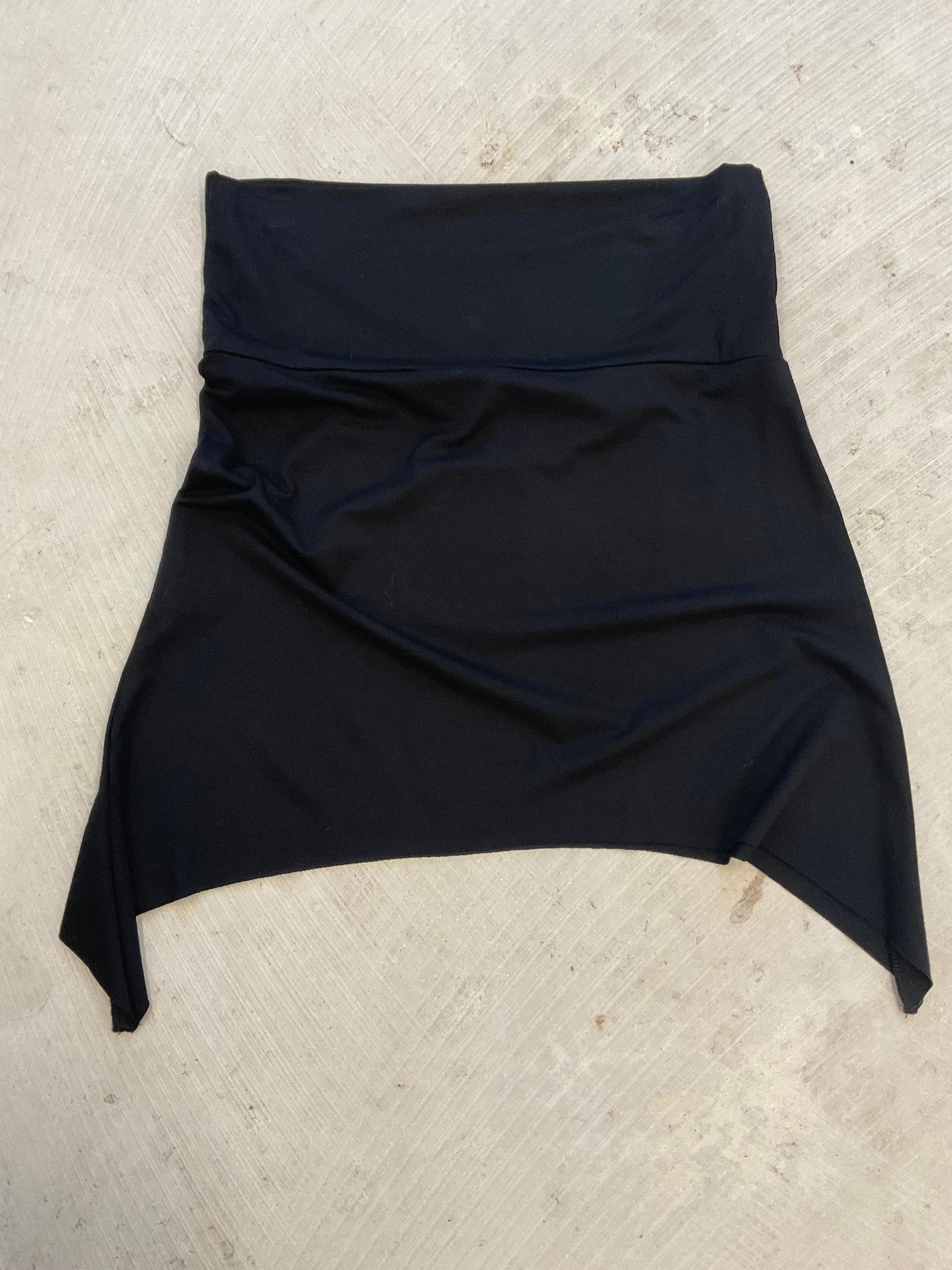 The asymmetrical hemline creates a modern, elongated silhouette, while the smooth elastic waistband sits comfortably on the hips or waist depending on how you style it.