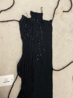 This sleeveless backless design features delicate hand embroidery with glass beads across the front, creating subtle light reflections against the textured knit.